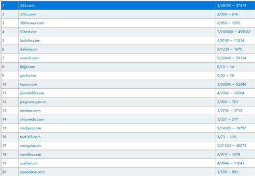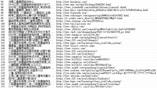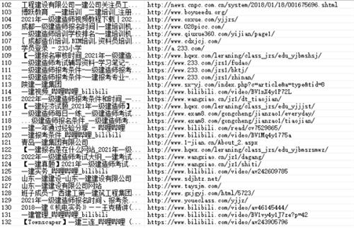根据核心关键词 4个,抓取前15页网站数据,筛掉*.baidu.com *.zhihu.com域名的数据,获取数据380条网址。在筛掉非行业网站的过程中发现一个有意思的事情B站出现的频次也是相当高,看样子B站上建造师学习的干货内容排名不差。