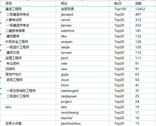 其他的一些数据可以根据自身需求去抓取或者通过百度指令查询获取,通过这些数据基本的可以了解建造师这个行业的排名情况、潜在流量的来源数据等。