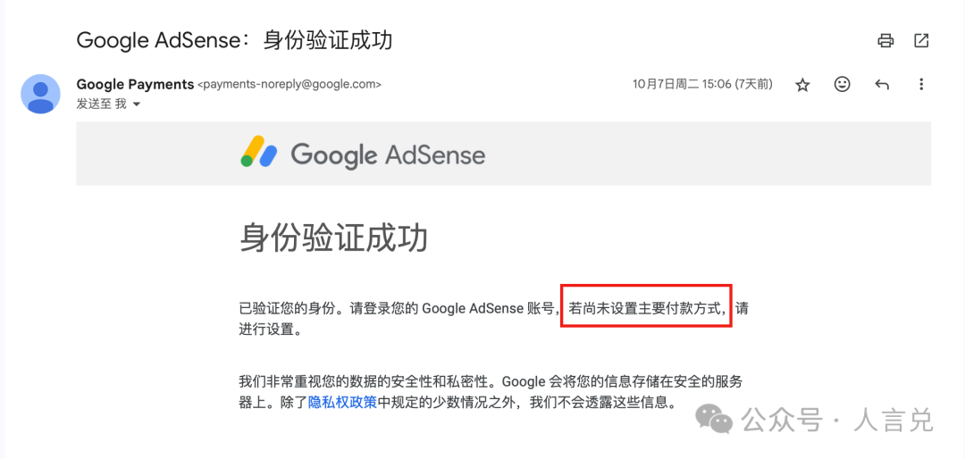 AdSense 账号累计收入首次达到 10 美元后会通知我们完成收款账号身份验证,验证通过后会有邮件通知我们设置主要付款方式: