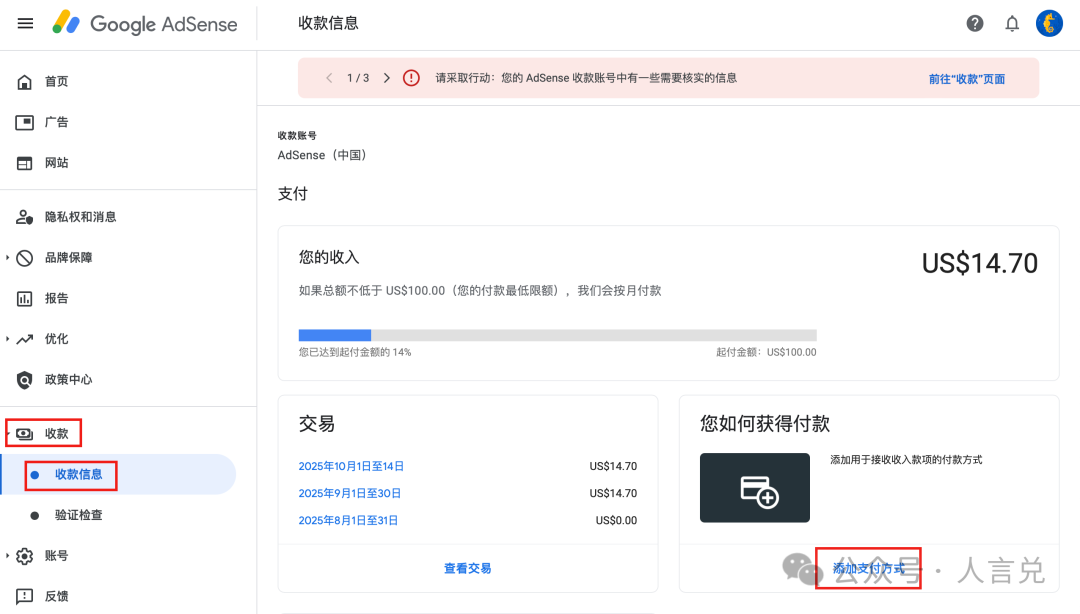 此时访问 AdSense 后台可以看到「收款信息」页面上多了一个「您如何获得付款」的卡片: