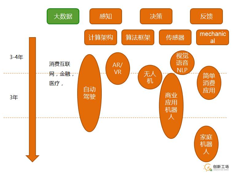 所以第一拨能出来应用的其实是这些,就是视觉、语音、自然语言处理,现在已经能用的这些成果的一些应用。比如印奇(Face++)的人脸识别,这个不需要很多其他的模块,自己已经成熟,现在已经可以用了,已经用在网上银行安防、安全的很多领域,这是第一拨不依赖这些基础模块就能直接使用的公司。包括语音识别自然源处理,这些东西已经可以直接使用了,或者现在直接开始研发了,但是其他的很多应用,比如说商业应用,比如我们想象中有很多的广义的自动化机械用在服务业,用在物流业,用在制造业,反而不会那么早开始。这里面有什么问题呢?用在商业领域的很多应用,它本身都是垂直应用,加在一起虽然非常大,但单个市场的规模都不大。所以在基础模块没有研发完成,没有便宜的基础模块使用的情况下,并不值得为一个单独的垂直小市场去做特别复杂的事,还不如等到比如三年之后各种各样的东西都成熟了,再用市场上比较完整的现存模块去做这些事。所以如果你看到现在说可以用广义的人工智能去做行业解决方案,或者做制造智能,肯定是假的。