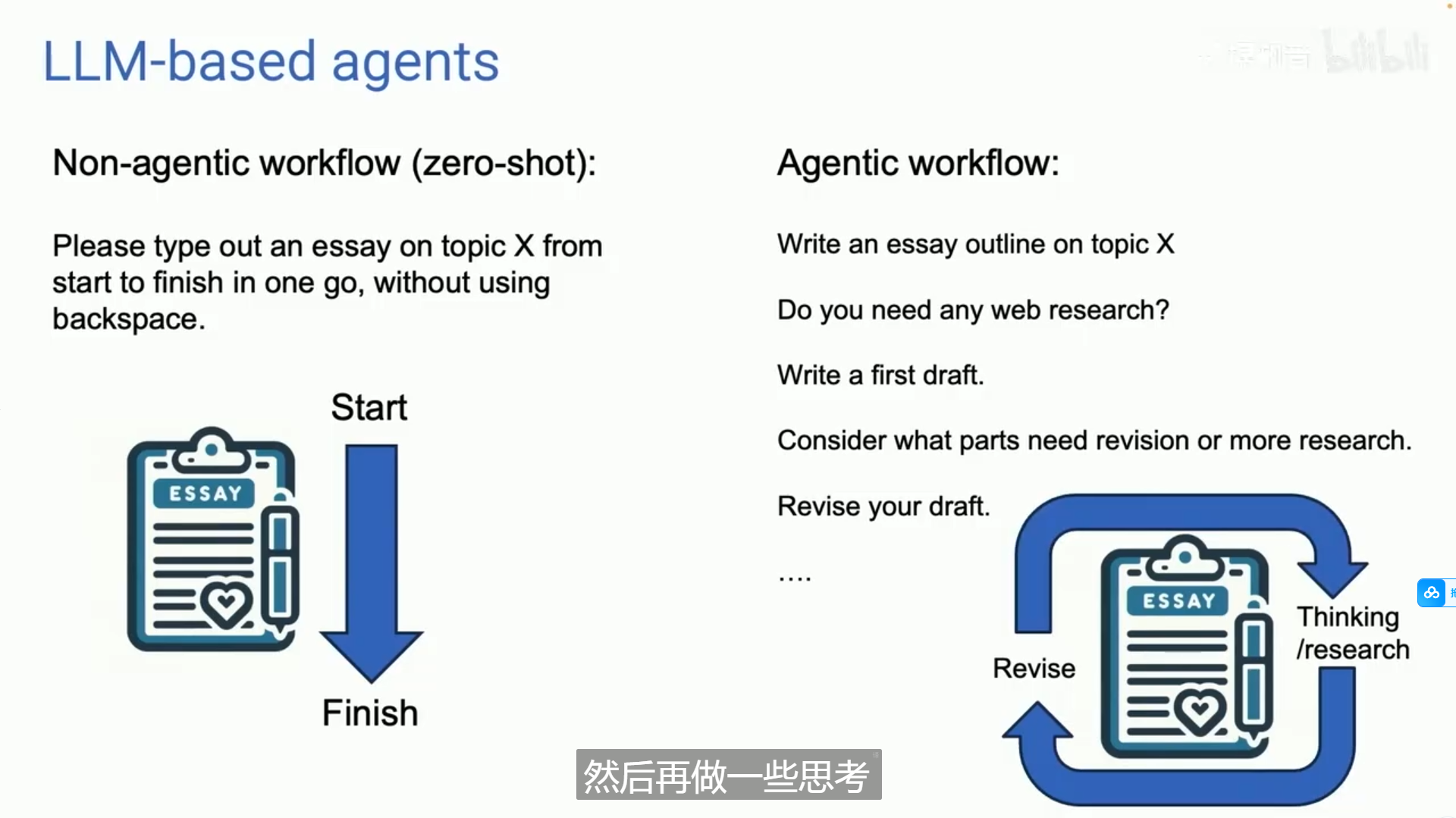 因此,这个AI Agent工作流有更多迭代,您可能会让LLM大模型进行一些思考,然后修改这篇文章,再进行一些思考,并多次迭代。
