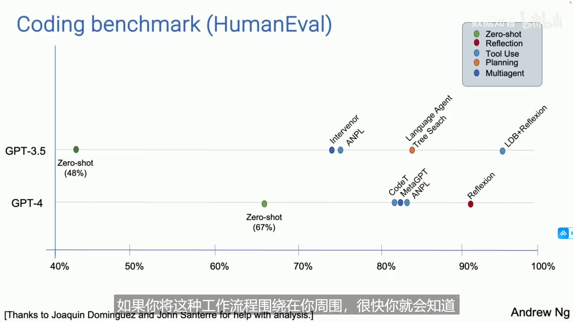 但如果你将一个 AI Agent 工作流围绕 GPT-3.5 进行构建,它实际上表现得比 GPT-4 还要好。