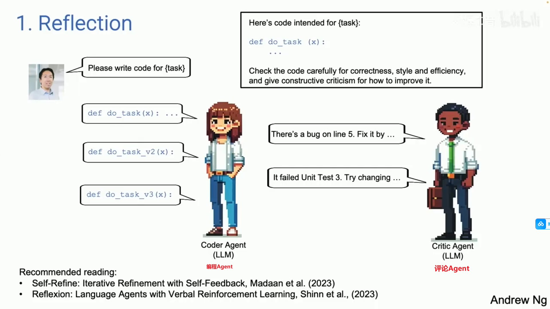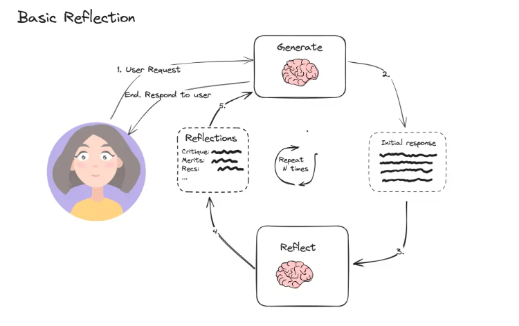 - 反思(Reflection): LLM 检查自己的工作,以提出改进方法。