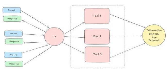 - 工具使用(Tool use): LLM 拥有网络搜索、代码执行或任何其他功能来帮助其收集信息、采取行动或处理数据。