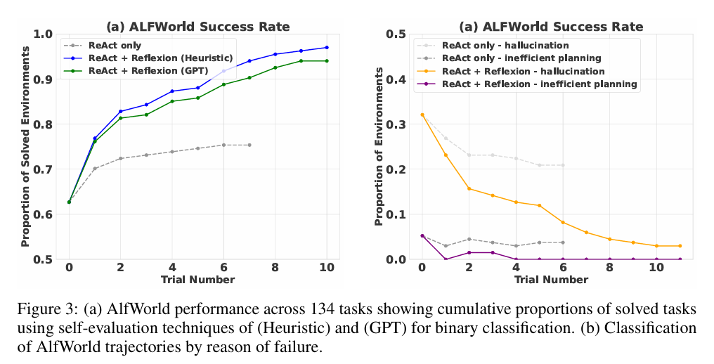 AlfWorld任务中,Reflexion框架能够有效解决幻觉(hallucination)和规划不足(inefficinet planning)问题,使得agent的任务完成率明显提升,在10次实验后最多完成130/134个任务。