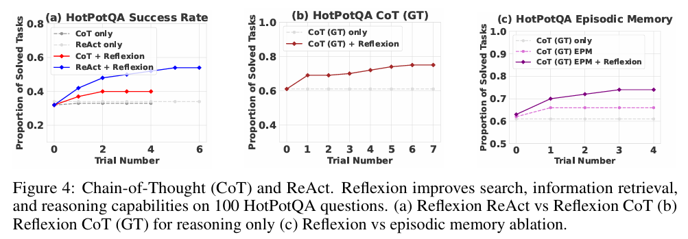 Reflexion的效果比所有的baseline都高出不少。 - 同时作者还对比了cot+EPM(episodic memory 类似一种长期记忆)和Reflexion框架(下图最右),发现