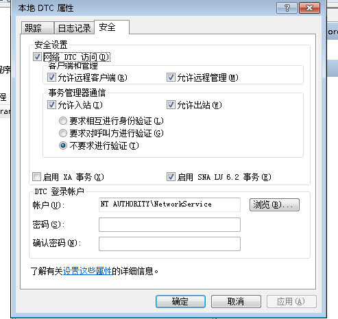 (5)保证DTC登陆账户为:NT Authority\NetworkService