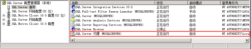 2.主服务器数据库安装完毕,打开SQL Server 配置管理器,把SQL Server 代理服务打开(已打开请忽略)