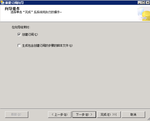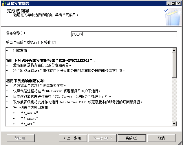 13.完成该向导,填写一个发布名称,点击完成,到此步骤主服务器本地订阅发布已经完成