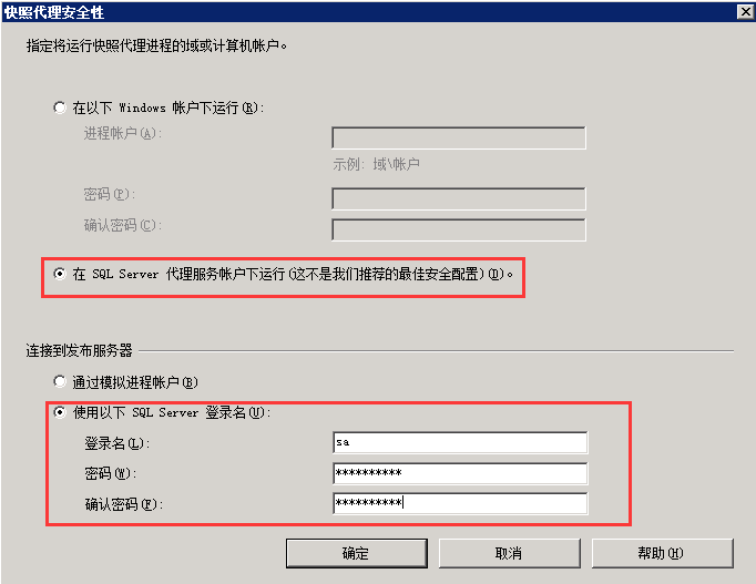 18.分发代理安全性,推荐按红色框中设置,如下图:(注意这里的账号密码,为相应服务器的实际账户密码)