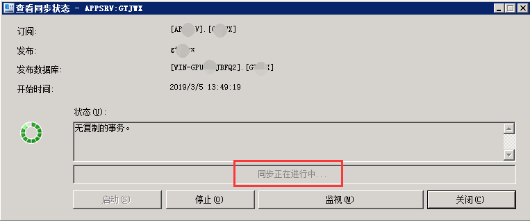 22.刷新从服务器左侧菜单栏下的本地订阅,会出现刚刚创建好的订阅,为了验证设置是否成功,右击创建好的订阅->查看同步状态,如图显示同步正在进行则说明双机热备份设置成功