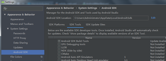 1、点击File — Settings… — appearance&Behavior — Android SDK — SDK Tools