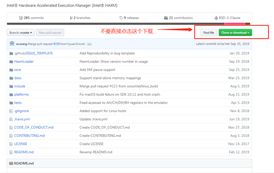 5、既然Android SDK不能帮我下载安装,那只能自己手动下载安装。查了资料,点击:https://github.com/intel/haxm 不要直接下载,因为没exe应用程序。拉到下面的Downloads,点击here,之后点击Latest release(最新版本),点击haxm-windows_v7_5_2.zip(我的是windows系统)。