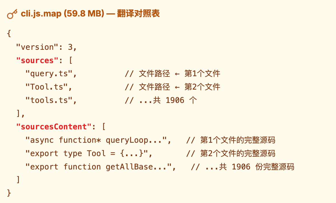 结果 Anthropic 的工程师在发布 Claude Code 2.1.88 版本的时候,打包工具 Bun 默认生成了 Source Map 文件,而他们忘了在发布配置里把 .map 文件排除掉。于是一个 59.8 MB 的 cli.js.map 文件就这么被直接发到了公开的 npm 仓库。