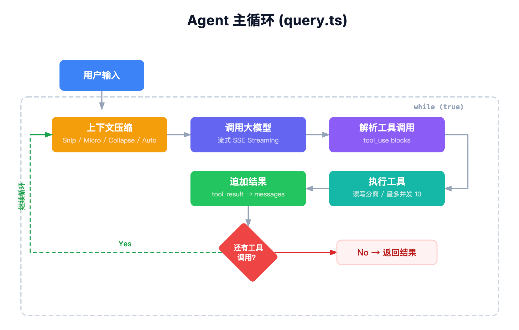 每次循环中,程序会通过 services/api/claude.ts 里的 queryModel 函数来跟大模型沟通。这个函数负责发送请求、接收 SSE 流式输出、累计 token 用量这些事情。模型返回的结果里如果包含 tool_use 类型的内容,说明 AI 还想调用工具继续干活,循环就接着转;如果没有 tool_use 了,说明任务做完了,循环就结束。