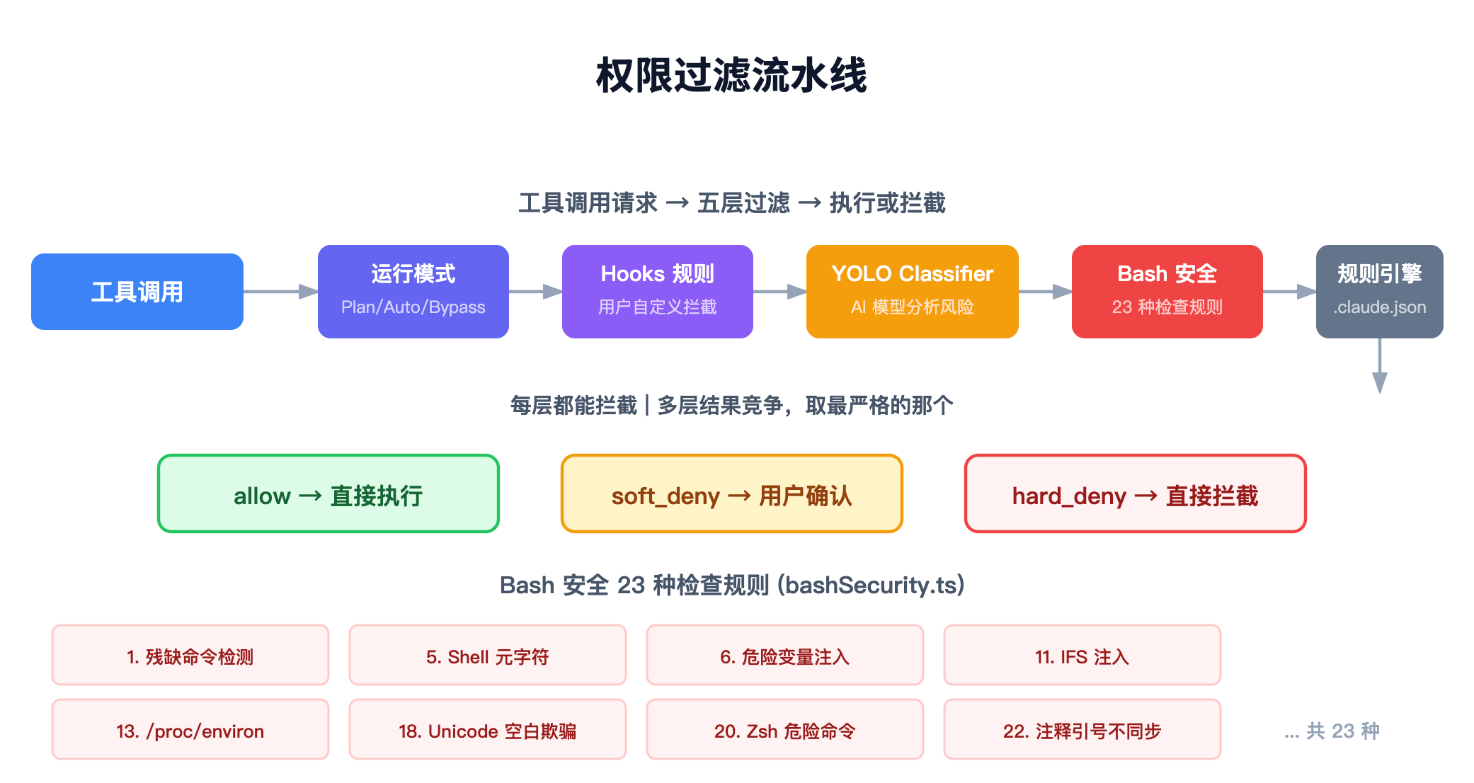 其中第 4 点 Bash 命令安全检查的严格程度远超我的预期。在 tools/BashTool/bashSecurity.ts 这个文件里,定义了 23 种 安全检查规则: