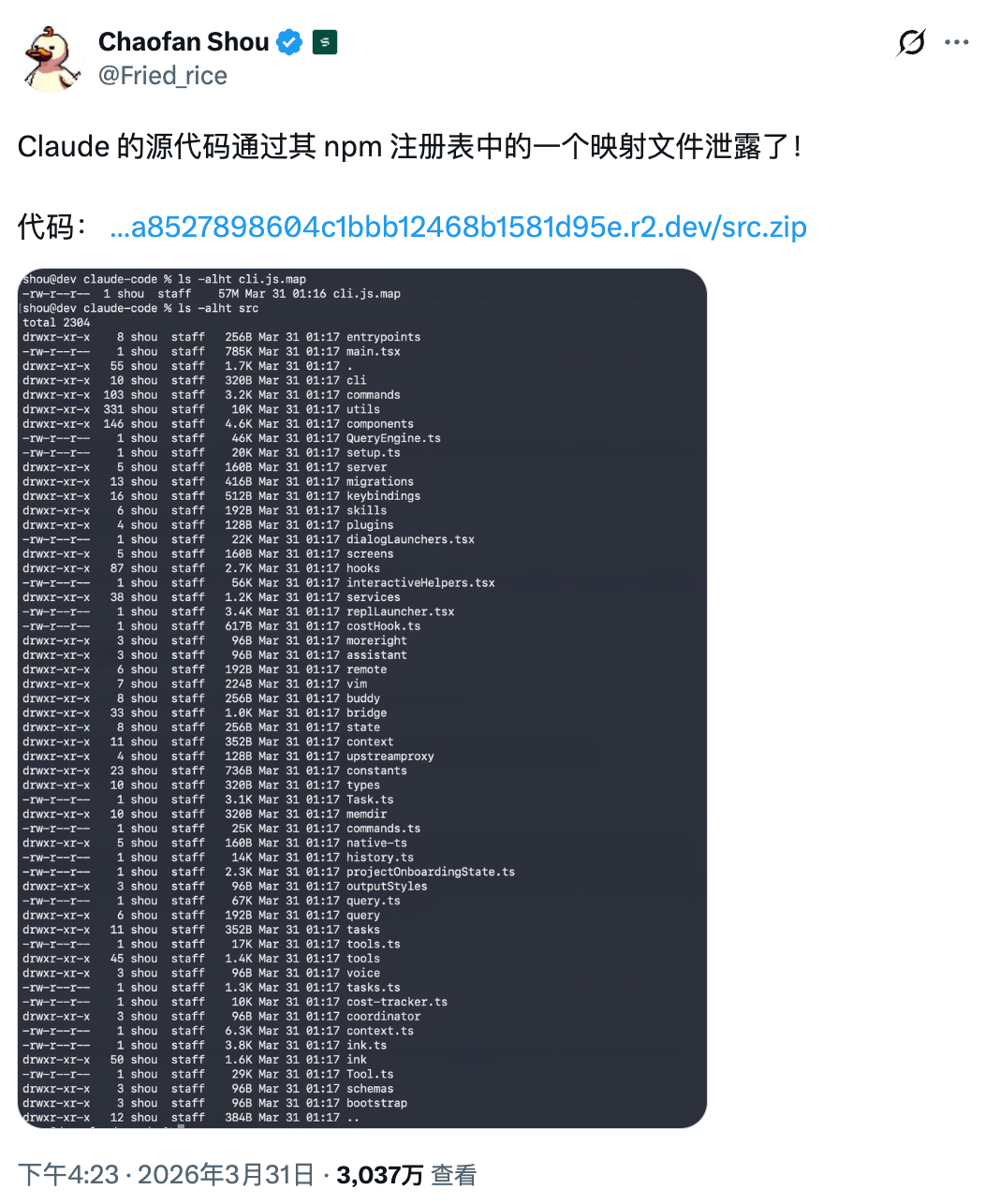 安全研究员 Chaofan Shou 最先发现了这个问题并发到了 X 上: