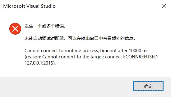 Cannot connect to runtime process, timeout after 10000 ms (reason: Cannot connect to the target: connect ECONNEREFFUSED127.0.0.1:2015).