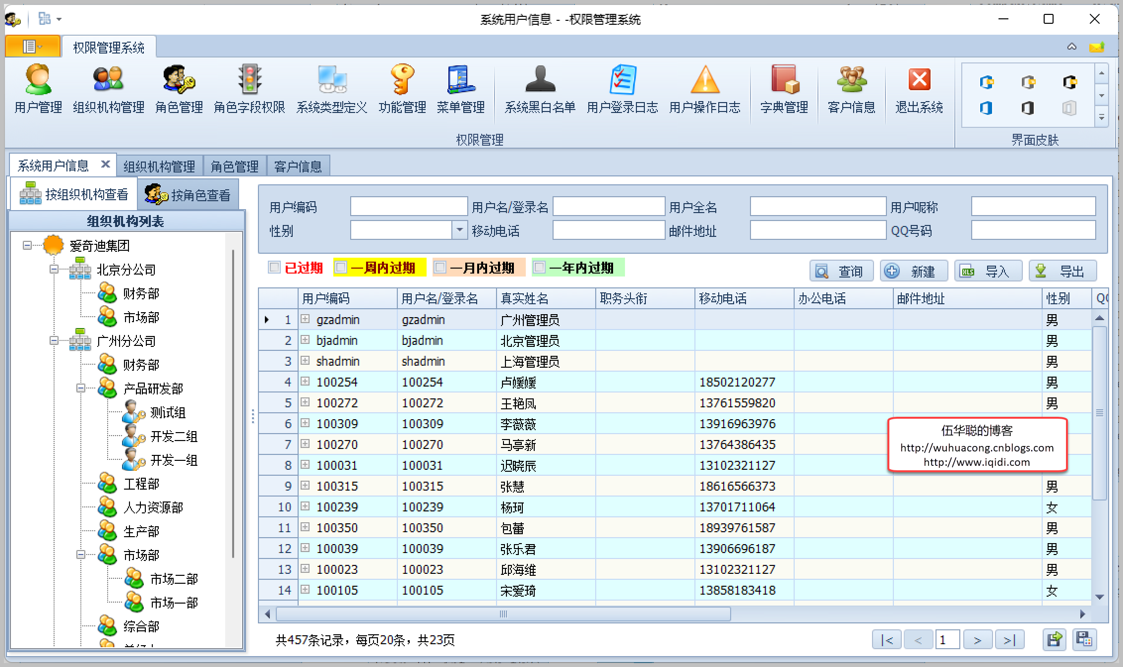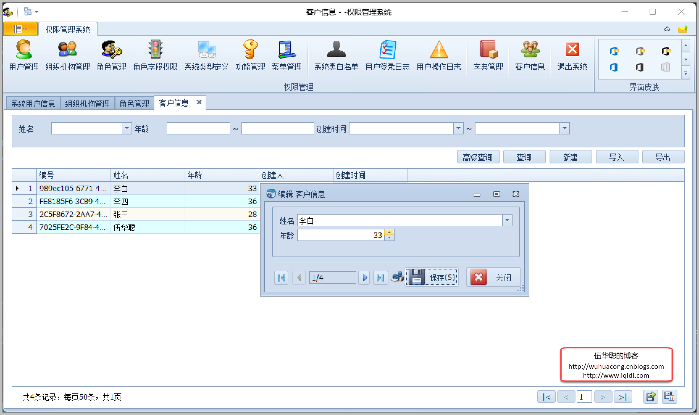 最后贴上一个整合SqlSugar处理而完成的系统基础框架的Winform端界面,其中包括用户、组织机构、角色管理、权限管理、菜单管理、日志、字典、客户信息等业务表的处理。