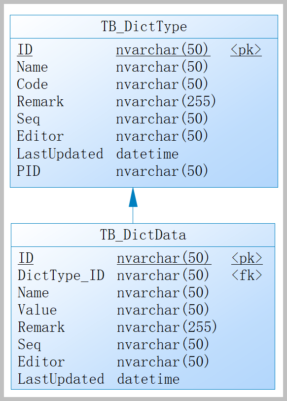 例如对于字典大类和字典项目的关系,如下所示。