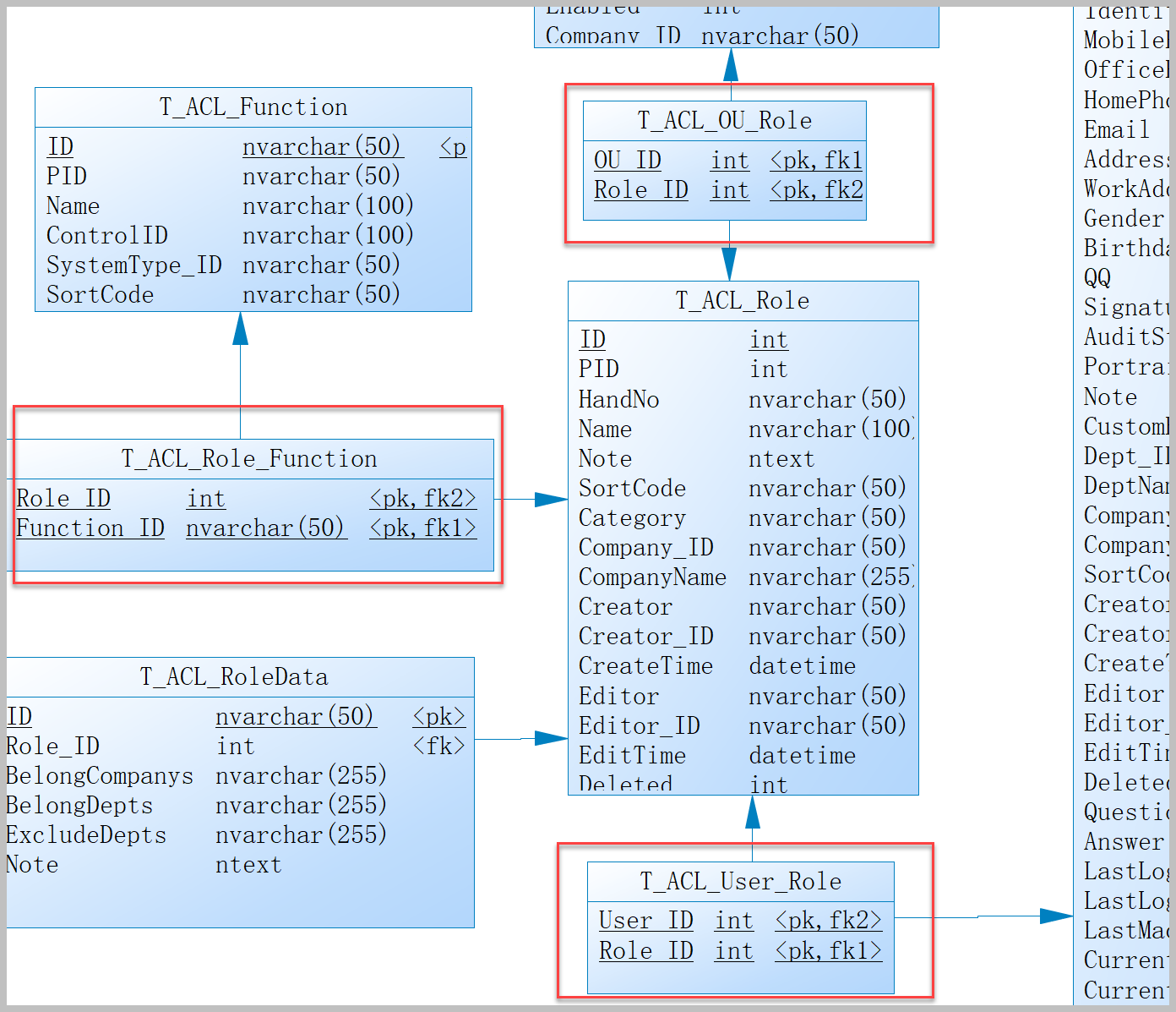 以及在权限管理系统模块中,用户、角色、机构、权限等存在着很多中间表的关系,如下所示。