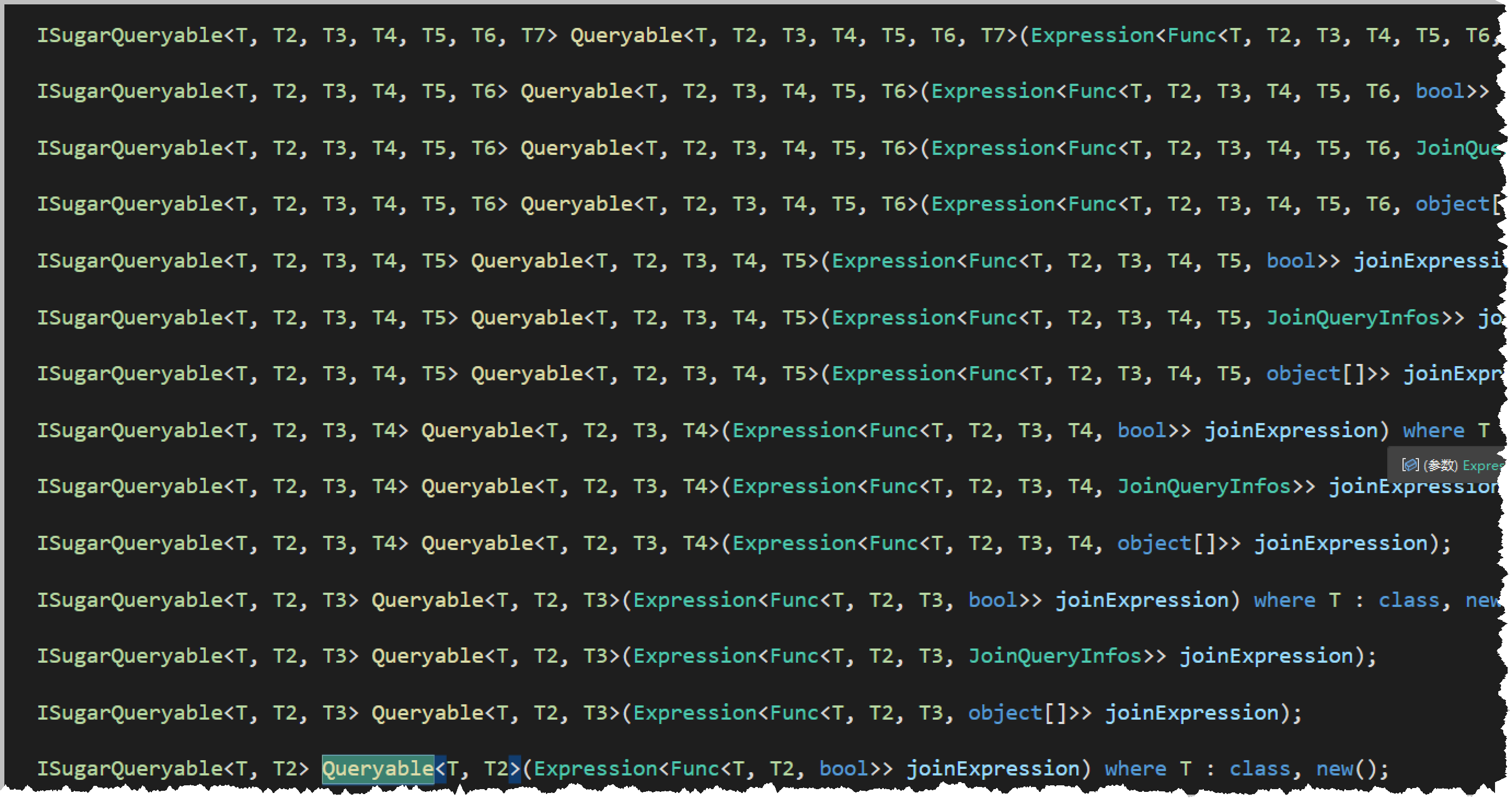 我们查看Queryable,可以看到这个SqlSugar基类函数 Queryable 提供了很多重载函数,也就是它们可以提供更多的表对象进行联合查询的,如下所示。