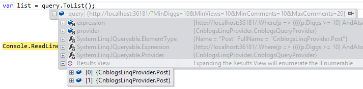 var provider = new CnblogsQueryProvider();var queryable = new Query<Post>(provider);var query = from p in queryable where p.Diggs >= 10 && p.Comments > 10 && p.Views > 10 && p.Comments < 20 select p;var list = query.ToList(); |