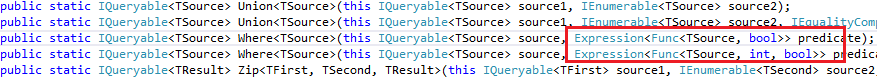 这些扩展方法来自System.Linq.Enumrable这个静态类下。我们可以看到两组扩展方法的不同之处在于IQueryable下传入的Expression类型,而IEnumrable下传入的是委托。这样做的用意是什么呢?您请接着往下看。