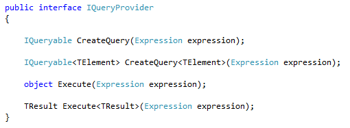 有了上面的Service之后,我们要做的事情就简单多了,但是在我们真正开始动手写自己的Linq Provider之前,先来看看IQueryable和IQueryProvider这两个重要的接口。