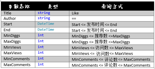 然后就到了我们的查询了,实际上我们有了IEnumrable<Post>的数据就可以直接在本地用Linq去查询它了。但是这不是我们想要的,因为我们上面的步骤是把所有的数据一次性全部下载下来了,而不是根据我们的需求返回数据。另外我们这里面是在博客园Service的基础上做一层封装,实现通过Url直接查询首页的文章。为什么要通过Url来查询?因为我们最后会通过我们自己的LinqProvider将Linq查询语句直接翻译成Url这样就能够实现远程的返回数据了。来看看我们对Url参数的定义: