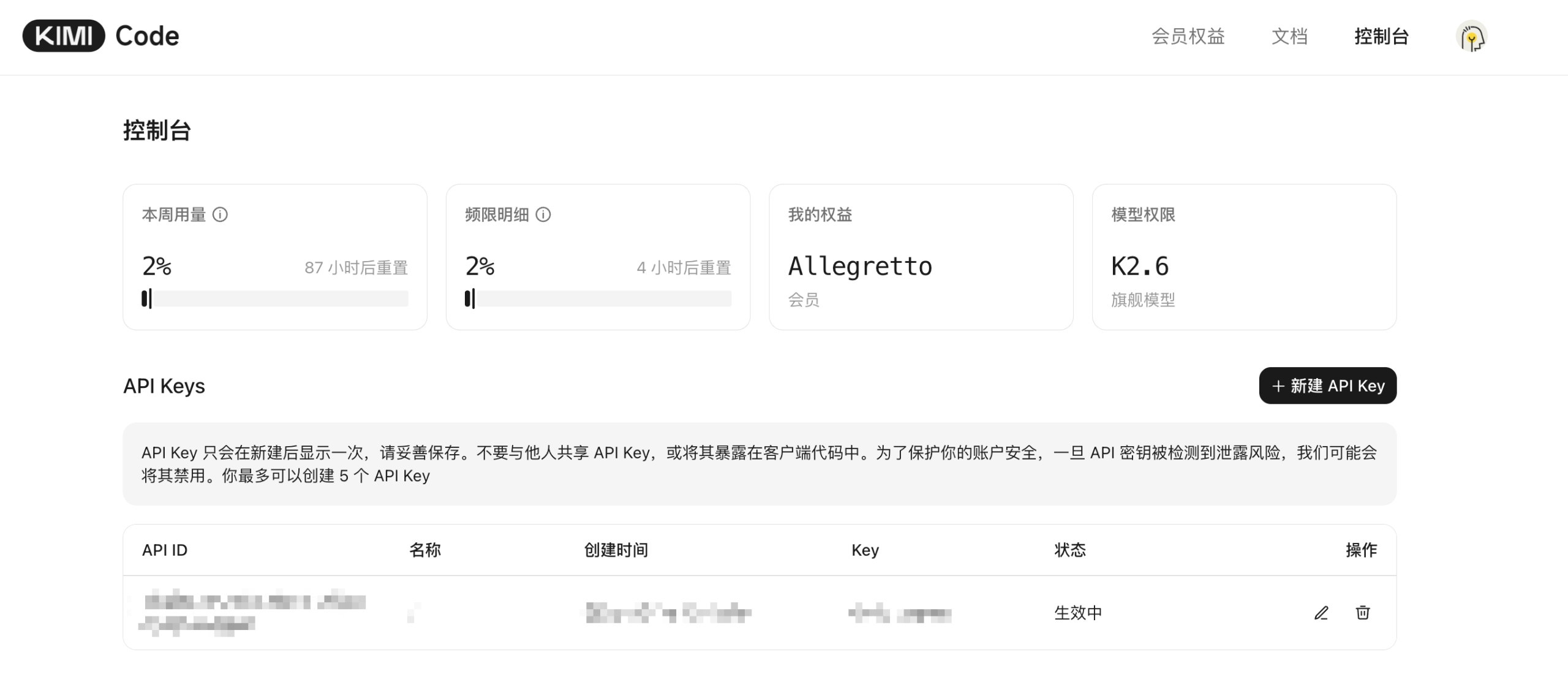 - 获取 Key:在 https://www.kimi.com/code/console 创建
