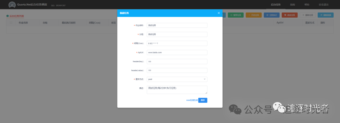 Quartz.NetUI是一个基于.NET Core + Quartz.NET + Vue + IView开箱即用的定时任务UI(不依赖数据库,只需在界面做简单配置)。