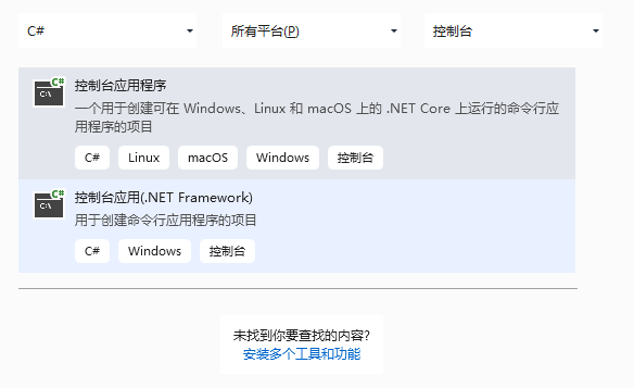 创建一个控制台程序,如下图可以看到有两个选项,一个是.net Framework,一个是.net core上运行的。