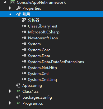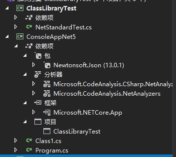 在两个项目中都引用了nuget包 Newtonsoft.Json,添加了ClassLibraryTest项目引用,建了一个Class1.cs的类文件。