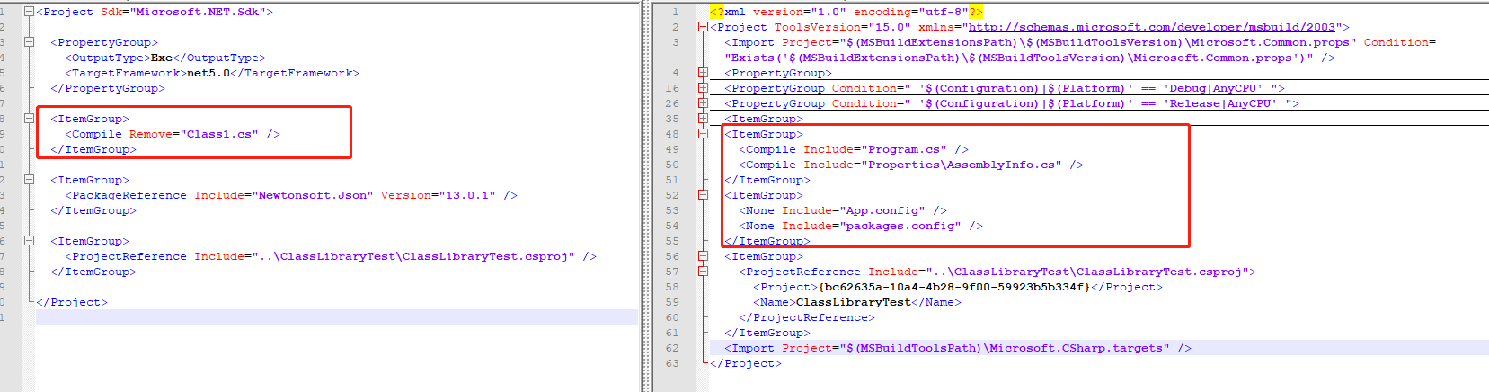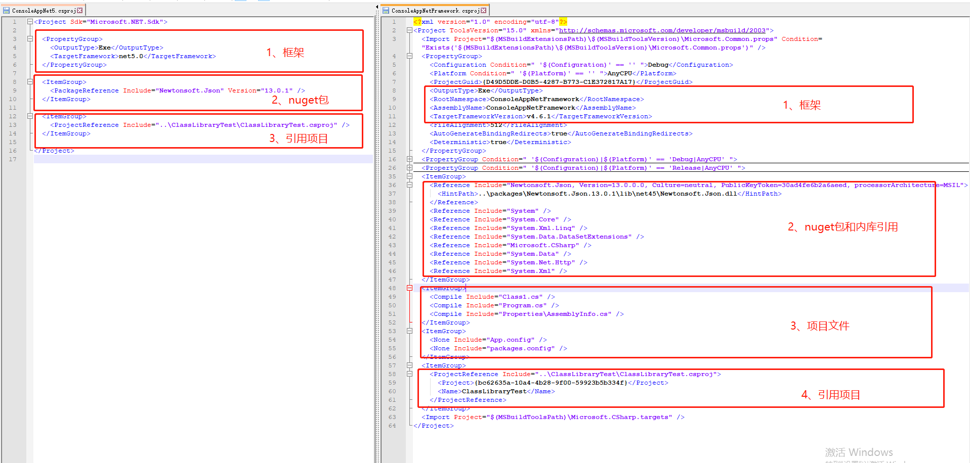 在项目里面找到项目文件.csproj,打开两个文件对比,左边是.net 5右边是.net framework 4.6.1。