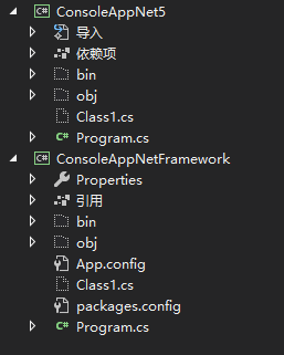 .net framework的所有引用都显示在一起,包括其它项目、nuget包、dll等等引用。但是他们最终都是用项目文件来管理这些东西,所以我们再看看他们项目文件的差异。