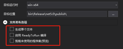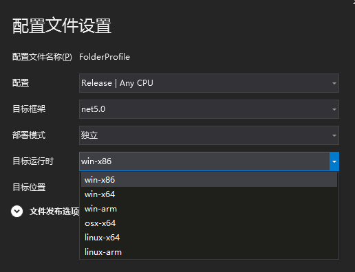 如果选择【独立】那么“目标运行时”只能选择特定的。因为包含了.net运行时和库,所以需要进行选择。如果不选择特定平台,这样就没办法将.net运行时和库正确的发布。