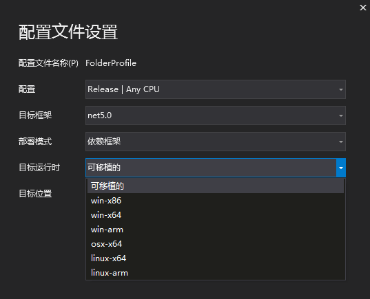 如果发布【依赖框架】那么运行环境需要安装.net 运行时,并且在发布配置“目标运行时”可以选择“可移植”,因为运行时是自主安装不需要包含,所以不需要发布指定的运行时。