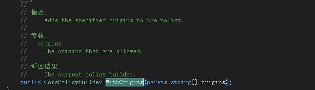 从截图中发现:WithOrigins的参数是一个params类型的字符串数组,如果要允许多个来源可以跨域,只要传一个字符串数组就可以了,所以代码修改如下: