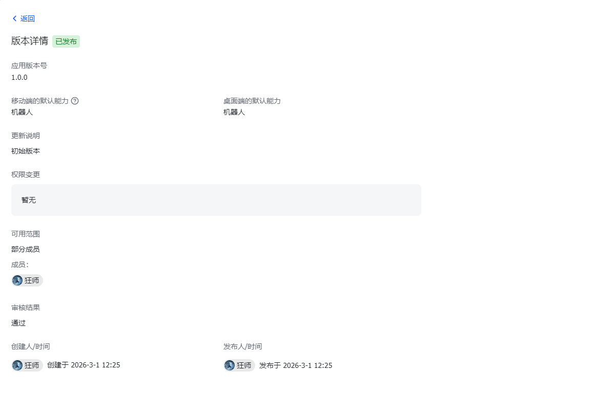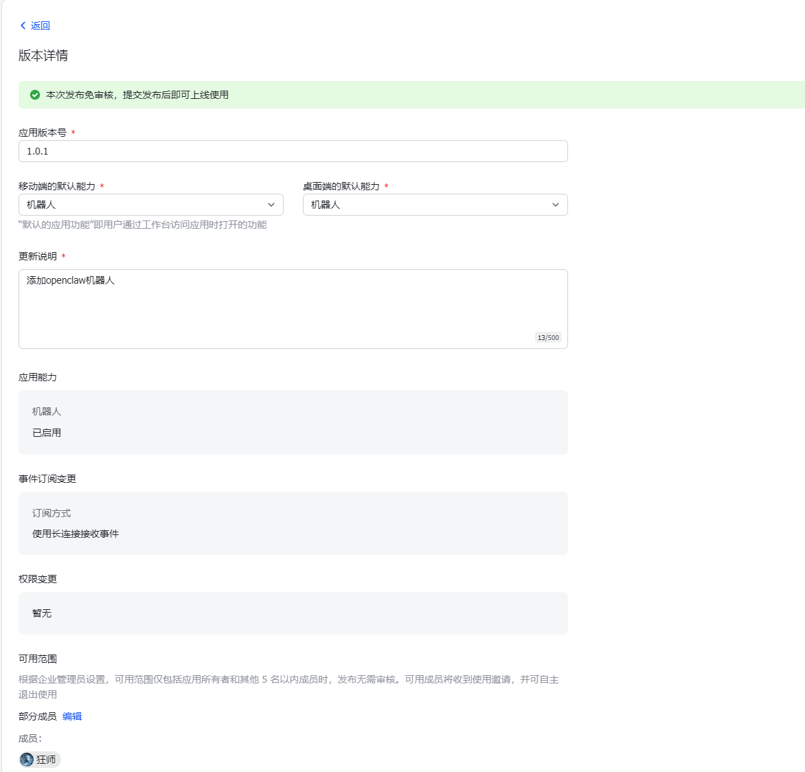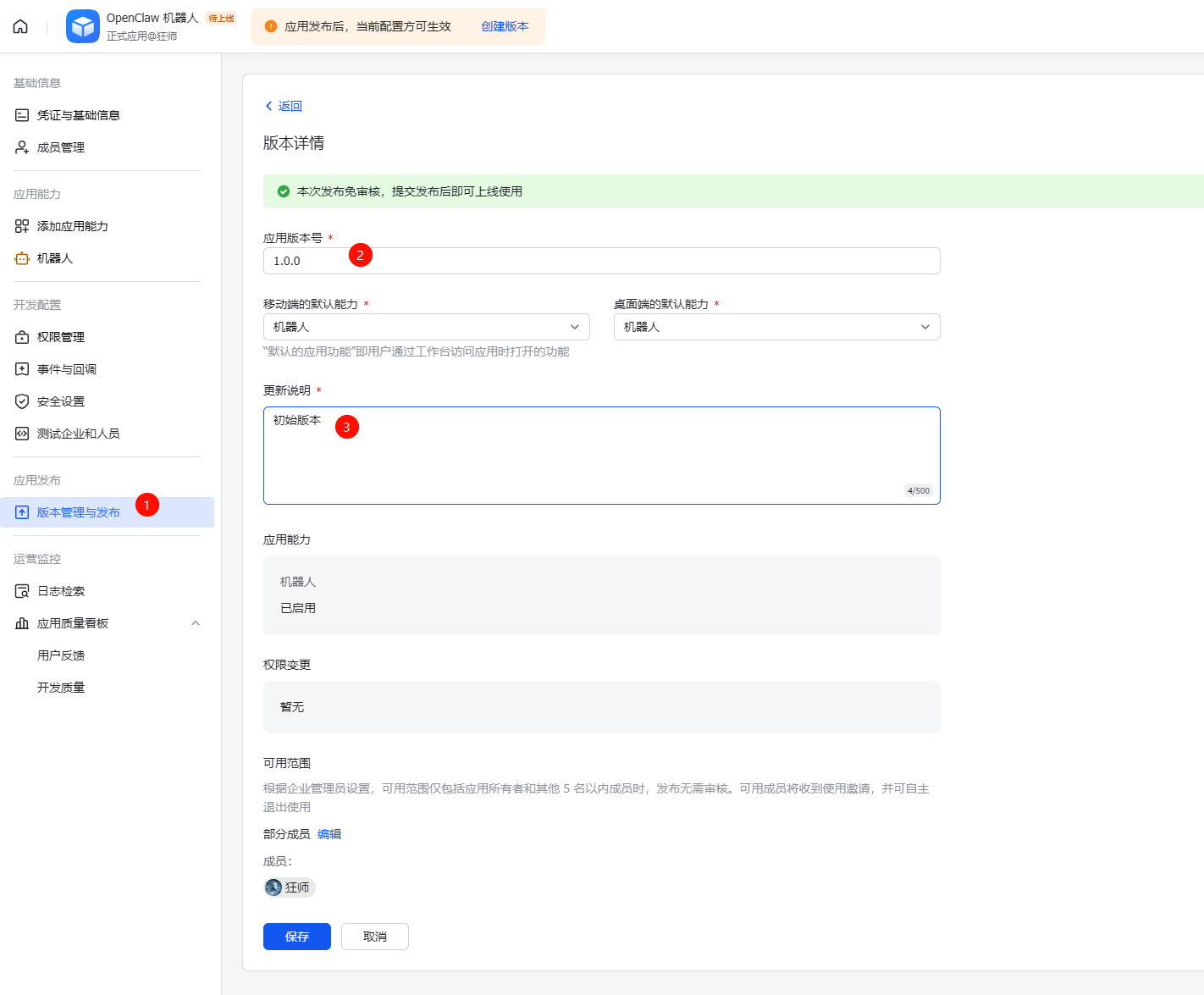填写版本号 → 填写更新说明 → 点击保存,确认发布(首次创建免审核,保存提交后即可上线使用)。