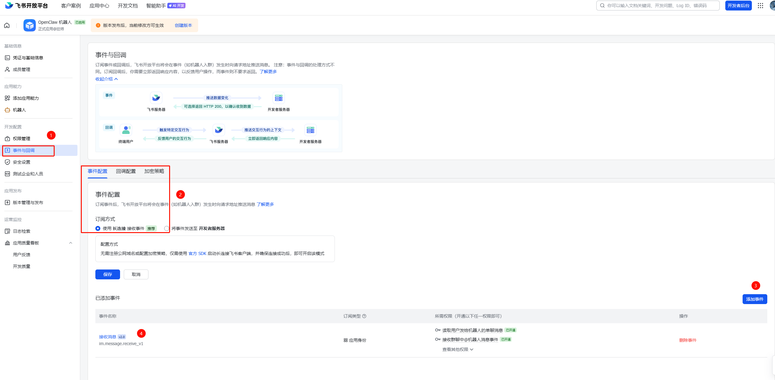 2、回到飞书开放平台配置事件订阅,在应用详情页左侧 → 点击左侧"事件与回调",在"事件订阅方式"中,选择"长连接"。添加事件:搜索并勾选 im.message.receive_v1,这个事件表示"收到消息时通知我"。