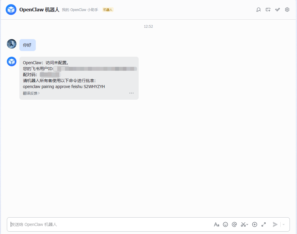 机器人会在飞书私聊里直接回一条配对提示,里面包含一段配对码(Pairing code)。