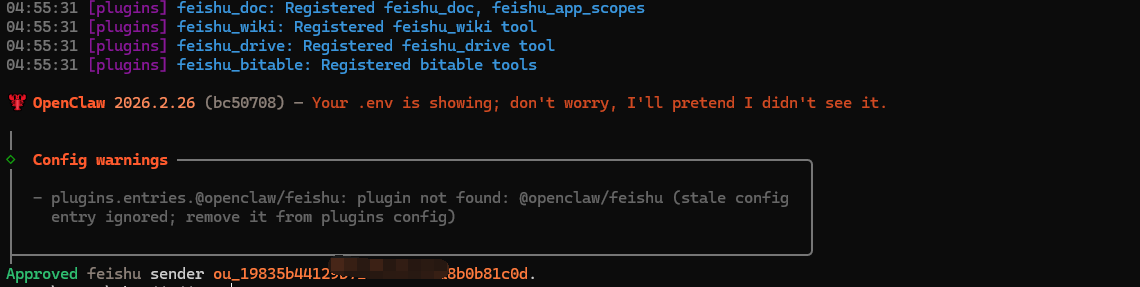 3、在终端审批配对,让用户把飞书私聊里看到的 Pairing code ,然后在终端执行:
