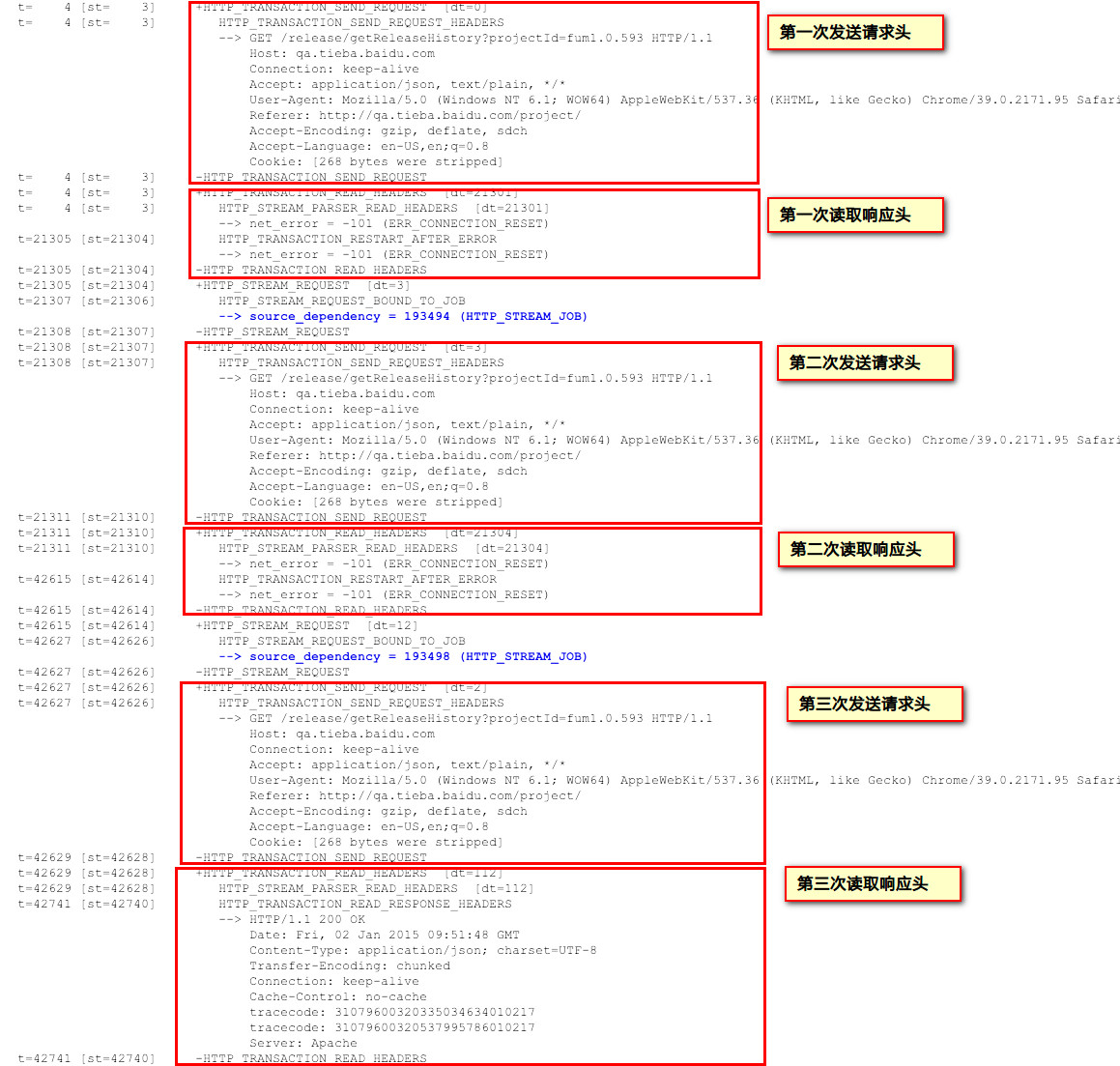 - 在上面的基础上,我们去发起一次新的请求。此时浏览器希望重用之前的连接以节省资源,用之前的一个socket去发起连接。21秒后收到服务器返回的重置信息(意思是服务器告诉浏览器:我和你之间没有连接),没关系,上面提到,我们有很多可以重用的连接,于是浏览器重新从可用的连接里面又选择了一个去进行连接,不幸的是,同样的情况再次发生,21秒后收到服务器的重置信息。这体现在日志上就是第二次重试失败。到第三次,因为前面浏览器认为可以重用的连接现在都被正确地标为断开了,没有新的可用,于是这次浏览器发起了全新的请求,成功了!