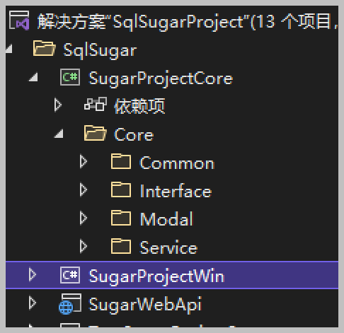 3)基础核心数据模块SugarProjectCore,主要就是开发业务所需的数据处理和业务逻辑的项目,为了方便,我们区分Interface、Modal、Service三个目录来放置不同的内容,其中Modal是SqlSugar的映射实体,Interface是定义访问接口,Service是提供具体的数据操作实现。其中Service里面一些框架基类和接口定义,统一也放在公用类库里面。