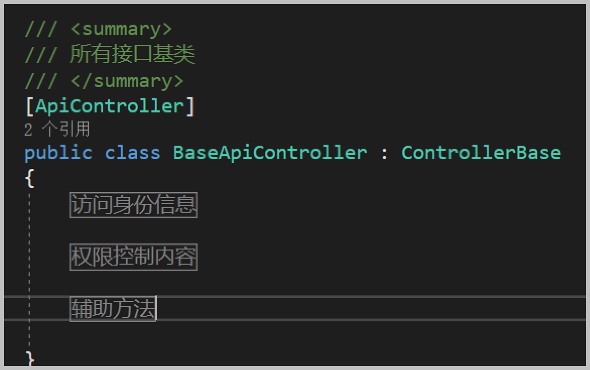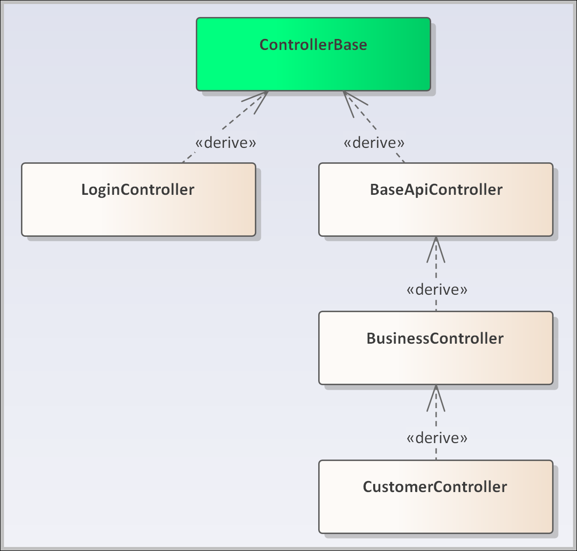 其中ControllerBase是.net core Web API中的标准控制器基类,我们由此派生一个LoginController用于登录授权,而BaseApiController则处理常规接口用户身份信息,而BusinessController则是对标准的增删改查等基础接口进行的封装,我们实际开发的时候,只需要开发编写类似CustomerController基类即可。