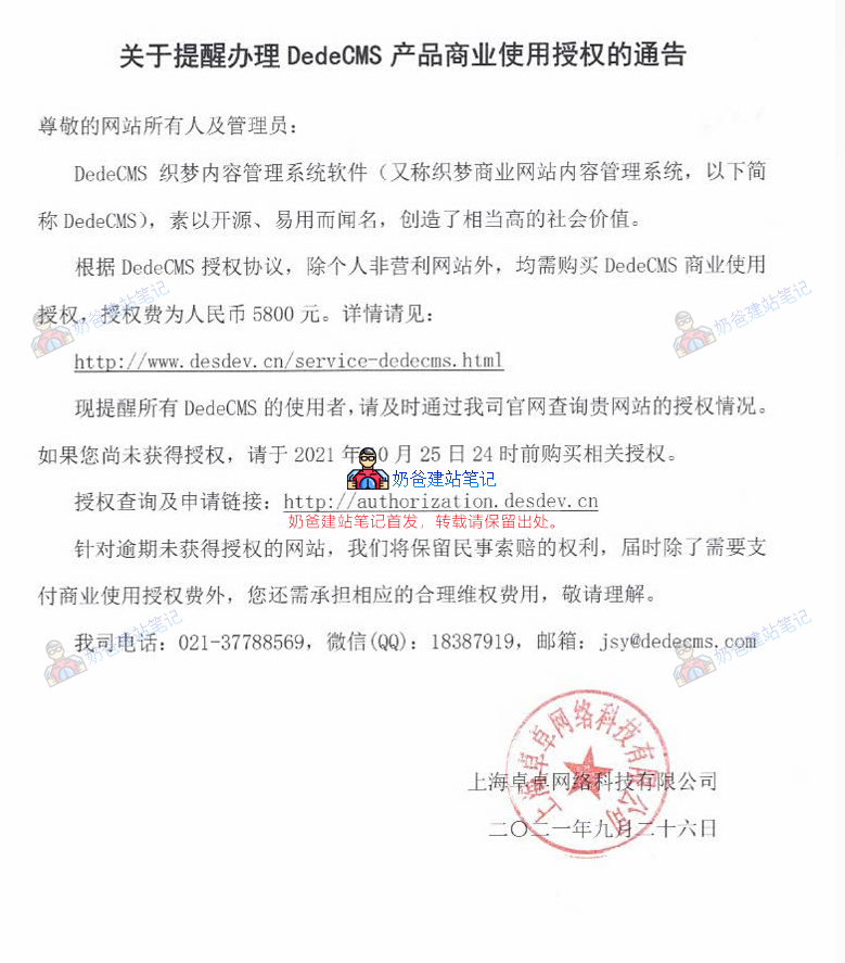 织梦dedecms是很多站长使用的国产CMS系统之一,近日织梦官方发表通知称商业用户需要购买授权费才能使用,费用为5800元/年,所以商用的站长最好更换掉其他免费开源的建站系统,例如WordPress,或者购买商业授权,毕竟国内的版权已经越来越严格了。