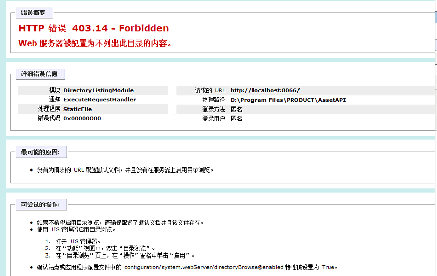 HTTP 错误 403.14 – Forbidden Web 服务器被配置为不列出此目录的内容,如图所示: