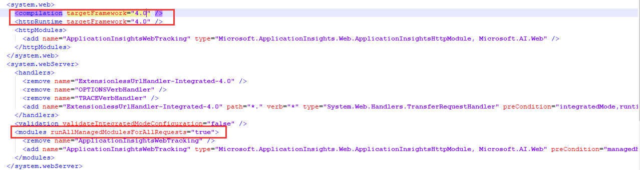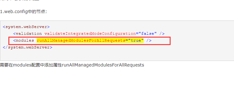 需要在modules配置中添加属性runAllManagedModulesForAllRequests,还有.net的版本,如图所示: